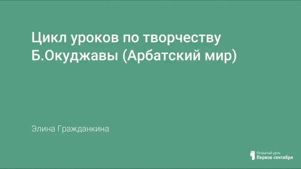 Второй урок построен в виде сценария, в котором говорится о судьбе Б.Окуджавы, его стремлении рассказать о своем Арбатском мире, мире, где живут добро, любовь, понимание. На протяжении всего урока ученики знакомятся с внутренним миром поэта, его переживаниями, опытами и начинаниями.