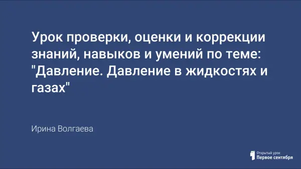 Урок проверки, оценки и коррекции знаний целесообразно проводить в конце изучения темы "Давление". В ходе урока проверяется качество усвоения учащимися системы знаний – понятий, законов, теорий – и умение проверять их на практике. Характерной чертой этого урока является поэтапная проверка знаний учащихся с последующей коррекцией и проверкой самим учеником или учителем. Каждому этапу урока соответствует задание различной степени сложности: от репродуктивных до творческих. На каждом этапе урока ученик имеет возможность проверить свои знания.