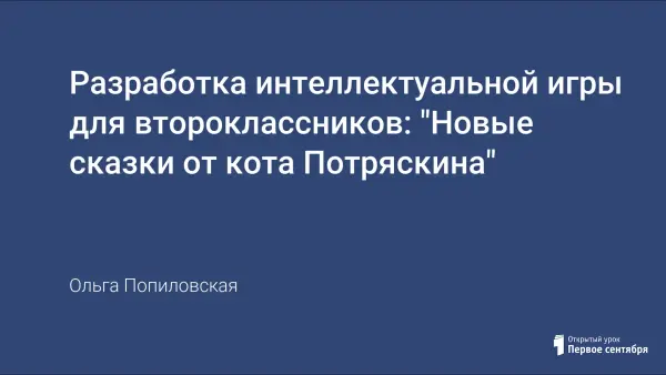 Интеллектуальная игра для второклассников "Новые сказки от кота Потряскина" разработана по мотивам сказок А.Гина с целью развития творческого мышления детей через создание благоприятной психологической атмосферы для общения детей и взрослых. По форме представляет собой игру-соревнование, где задания для участников предъявляются таким образом, чтобы успех зависел от вклада каждого.