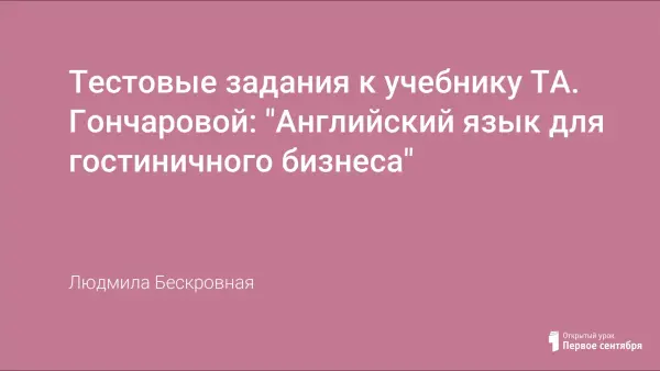 Вашему вниманию предлагается ряд тестовых заданий для проверки текущих знаний учащихся, разработанных на основе пройденных первых шести разделов пособия ("Приветствие", "Услуги в отеле", "В ресторане", "Бронирование номеров", "Регистрация в отеле", "Извинения").