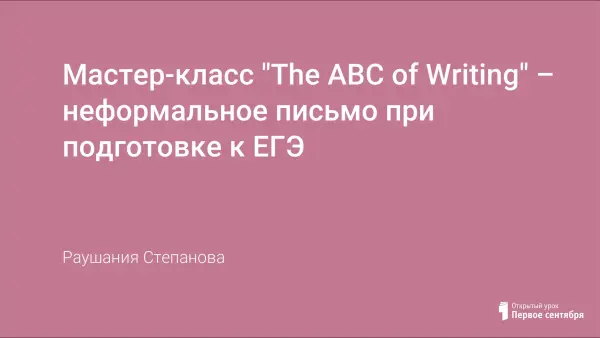 Целью мастер-класса является научить учащихся писать неформальное письмо личного характера в формате ЕГЭ. На уроке дан образец письма и правила его написания, представлены тренировочные упражнения, включающие работу с параграфами, словами-соединениями (linkers) и речевыми клише.