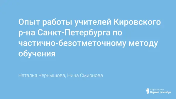Методическим объединением учителей Кировского района Санкт-Петербурга накоплен большой опыт по безотметочному и частично-безотметочному методам обучения младших школьников, по которым и в настоящее время ведётся большая работа.