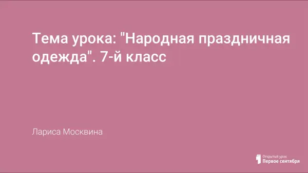 Урок "Народная праздничная одежда" проводится для учащихся 7-х классов с целью ознакомления учащихся с особенностями русской праздничной одежды, развития знаний о традициях народной одежды, воспитания чувства прекрасного, чувства гордости за глубокие исторические и духовные корни нашей страны.