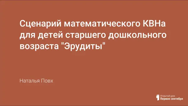 В результате математического образования дошкольник не только совершенствует счетную и измерительную деятельность, получает элементарные представления, но и становится умнее, сообразительнее, увереннее в рассуждениях, в комбинировании различных способов при решении нестандартных вопросов. Задания на сообразительность, задачи-шутки, задачи-ловушки используются и для обучения, и для развлечения. Они развивают гибкость ума, дают возможность упражняться в применении своих знаний, требуют смекалки, внимания, воображения, настойчивости, смелости в предположениях. Предлагаю вашему внимания сценарий КВНа по математическому образованию и развитию для детей старшего возраста "Эрудиты".