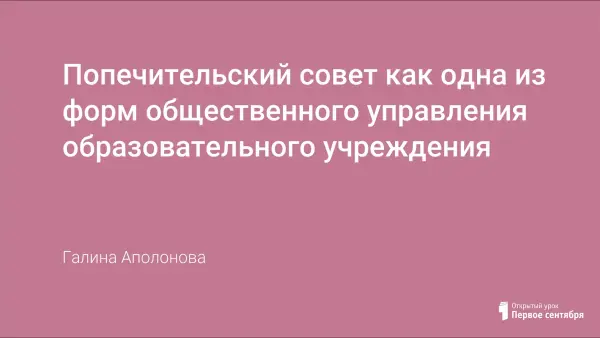 В рамках документов по модернизации школы большое внимание уделено повышению качества управления, и именно поэтому среди приоритетных задач - задача развития институтов общественного участия в управлении. Современная школа находится в условиях стабильного, но недостаточного бюджетного финансирования, поэтому, естественно, всех нас волнует проблема привлечения дополнительного финансового источника для поддержания функционирования учреждения, а прежде всего — развития образования. И попечительский совет дает такую возможность.