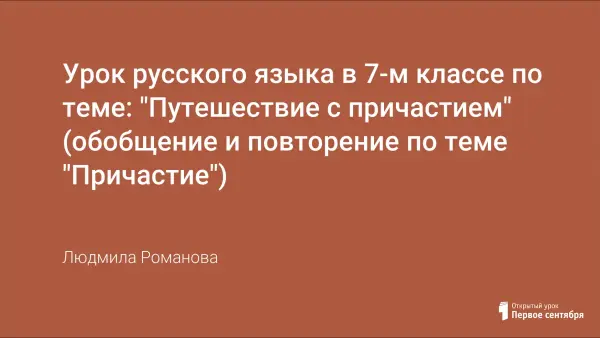 Предложенный урок нацелен на систематизацию и обобщение знаний о причастии; проверку прочности усвоения темы. Учащиеся расширят свои знания по теме, отработают умения устного и письменного общения. Повышению мотивации в изучении русского языка способствуют новые информационные технологии (презентация). В процессе деятельности внимание, интерес семиклассников к изученному материалу акцентируется в ходе путешествия, где ожившее причастие "говорит".