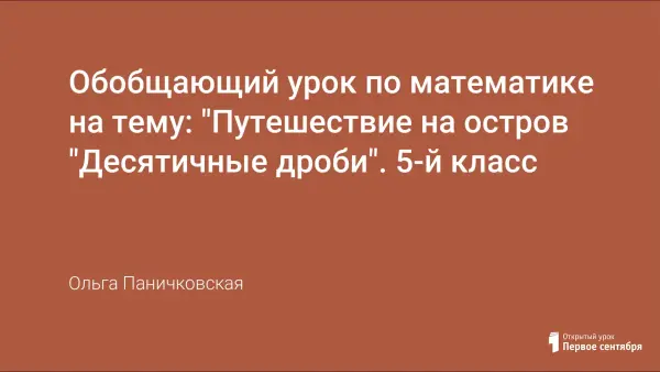 Во время урока учащиеся совершают путешествие на остров "Десятичные дроби". В игровой форме происходит повторение, обобщение и систематизация знаний, умений и навыков. Отслеживается связь десятичных дробей с натуральными числами.