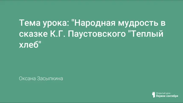 Урок является заключительным на этапе изучения рассказа К.Г. Паустовского "Теплый хлеб". Задачи урока: ввести учащихся в неповторимый мир авторской сказки, помочь увидеть им глубину содержания, народную мудрость, выйти на понимание смысла названия, активизировать познавательную и поисково-исследовательскую деятельность учащихся, продолжать работу над теоретико-литературоведческими понятиями, работать над развитием речевых навыков.