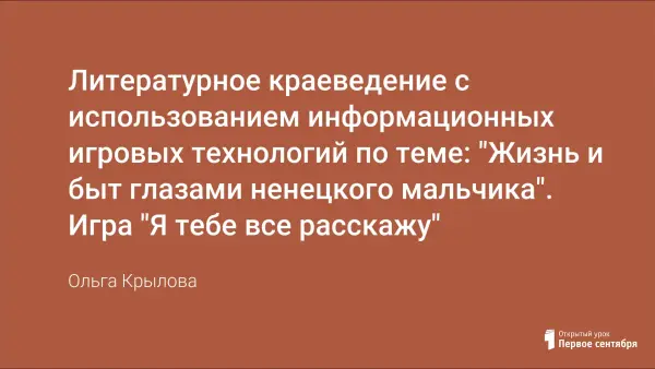 Суров этот далёкий край: долгая и холодная зима, короткое и совсем не жаркое лето, жестокие морозы сковывают почти до дна озёра и реки Крайнего Севера. Но живут среди этой вечной мерзлоты замечательные и доброжелательные люди коренных национальностей – ханты, ненцы, селькупы. Каковы же обычаи и быт этих людей? Какой же их основной промысел? Во что играют дети? Как они одеваются в лютые морозы, чтобы не замёрзнуть? Играя в игру "Я тебе всё расскажу", мы совершим путешествие в родные места ненецкого мальчика. Он расскажет нам много нового и интересного о своём народе. Из его рассказа мы получим ответы на все эти вопросы.