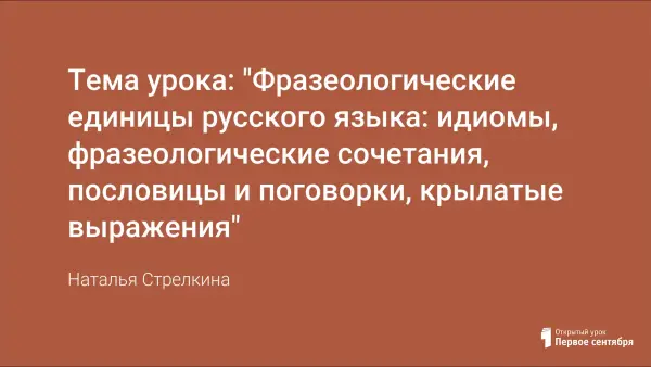 Урок русского языка в 10-м классе по теме "Фразеологические единицы русского языка: идиомы, фразеологические сочетания, пословицы и поговорки, крылатые выражения" преследует следующие цели: повторить основные сведения о фразеологии; развивать и культивировать внимание к фразеологизму как социально значимому явлению, чтобы учащиеся научились отбирать, подбирать фразеологизмы, произносить их со смыслом так, чтобы речь была интеллектуальной деятельностью, а не рефлекторным актом; воспитывать ценностное отношение к фразеологизмам, их значению, прививать навык обращать внимание на непонятные слова в художественном произведении, в учебниках, газетах, журналах и пользоваться словарем; пробуждать стремление узнать значение таких выражений и словосочетаний, вводить их в речь и не употреблять те, значения которых не знаешь; развивать творческие способности учащихся.