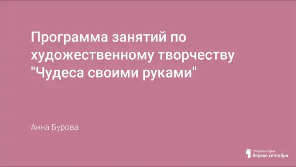 Программа составлена для детей 5–7 лет с учётом их возрастных особенностей. Цель программы – раскрыть творческие способности детей через освоение различных видов художественно-прикладного искусства. На занятиях используются различные игры, позволяющие сохранить и укрепить психологическое здоровье ребенка.