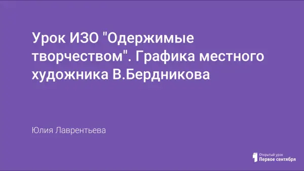 Цели урока: закрепить знания учащихся о видах изобразительного искусства, повторить понятие графика; познакомить учащихся с творчеством местного художника В.Бердникова; научить присматриваться к красоте родной природы, эмоционально воспринимать окружающую действительность; воспитывать уважение и чувство гордости к людям, чья жизнь является примером для молодого поколения.