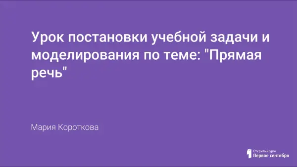 Урок постановки учебной задачи и моделирования по теме "Прямая речь" построен в системе развивающего обучения Д.Б. Эльконина – В.Д. Давыдова. На уроке раскрываются закономерности постановки знаков препинания при прямой речи. Создается ситуация успеха для демонстрации определенных способов работы, при осмыслении нового материала возникает проблемная ситуация. Исследуя предложенные учителем примеры, ученики формулируют учебную задачу. На уроке основополагающим является метод решения учебных задач, предусматривающий организацию самостоятельной исследовательской деятельности учащихся по открытию и усвоению системы теоретических понятий.