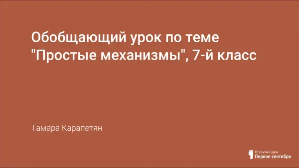 Обобщающий урок по теме "Простые механизмы" разработан для учащихся 7-го класса. Данная тема не является простой для понимания учащихся, так как век бурного развития научно-технического прогресса и информационно-компьютерных технологий для учащихся непонятен смысл изучения "каких-то" простых механизмов. Задача учителя заключается в том, чтобы показать практическую значимость изучения темы, как на основе полученных знаний можно объяснять различные жизненные ситуации. Идея урока заключалась в привлечении субъектного опыта ребенка для решения задач практической направленности, а групповая работа в группах переменного состава направлена на формирование коммуникативной компетентности обучающихся.