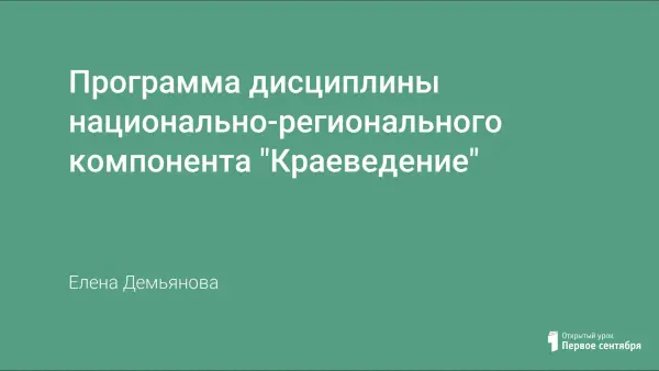 Представленная авторская программа "КРАЕВЕДЕНИЕ" обеспечивает реализацию национально-регионального компонента стандарта среднего профессионального образования цель которой - сохранение национальной идентичности личности. Программа обладает универсальностью и может быть переориентирована для любого региона РФ.
