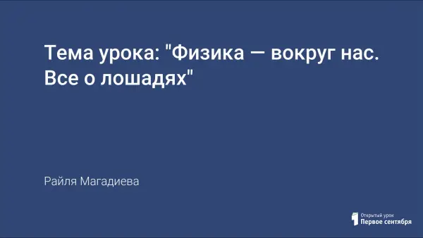 Какими физическими величинами можно характеризовать движение лошади? Урок знакомит и закрепляет такие физические понятия как — скорость, центр тела, плотность, давление твердого тела, давление жидкости, сила упругости, жесткость тела, а также знания о лошадях.