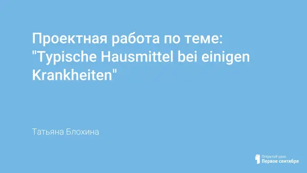 В процессе работы над проектом у учащихся 9-го класса формируется представление о возможности лечиться при некоторых заболеваниях не медикаментами, а домашними средствами, в каждой семье своими традиционными. Эта работа позволяет учащимся применить свои речевые способности на практике, добывать и анализировать информацию, взаимодействовать с другими участниками работы и с учителем. Конечным результатом проекта является составление брошюры: "Typische Hausmittel bei einigen Krankheiten".