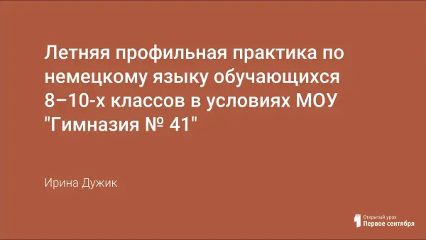 В данной статье речь пойдёт об организации проведения летней профильной лингвистической практики по немецкому языку в условиях муниципальной общеобразовательной гимназии № 41 г. Кемерово.