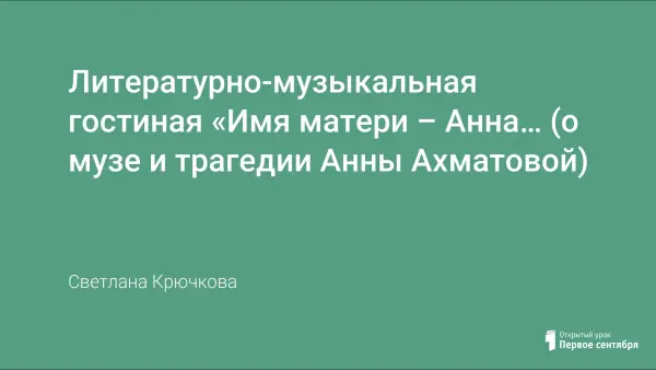 Цель литературно-музыкальной гостиной: популяризация творчества великого поэта Серебряного века русской поэзии ХХ столетия Анны Андреевны Ахматовой, постижение особенностей художественного мира ее поэзии. Сценарий литературной гостиной «Имя матери – Анна…» разработан для мероприятия, посвященного 135-летию со дня рождения Анны Ахматовой. Литературно-музыкальная гостиная составлена в соответствии с основными положениями ФГОС нового поколения. Отличительной особенностью нового стандарта является его деятельностный характер, ставящий главной целью развитие личности обучающегося.