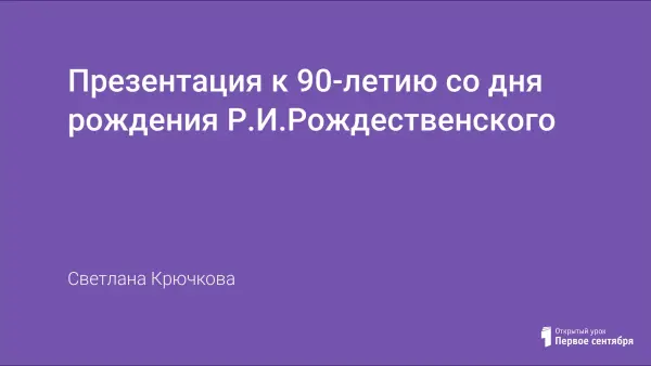 Данная презентация подготовлена к литературно-музыкальной гостиной, посвящённой 90-летию со дня рождения выдающегося поэта XX века, автора текстов популярных песен, переводчика Роберта Ивановича Рождественского. В работе рассказывается о жизненном и творческом пути поэта. Кроме того, используются воспоминания самого автора, его жены Аллы Киреевой, его близких и друзей (Андрея Вознесенского, Евгения Евтушенко, М.Мудрика, Л.Анненского). На встрече в творческом исполнении преподавателей школы, старшеклассников и известных артистов звучали стихотворения поэта, песни на его слова. Такого рода мероприятия можно использовать как в учебной, так и во внеурочной деятельности. Целью данной гостиной является, несомненно, важная для подрастающего поколения вещь: прикоснуться к миру поэзии этого удивительного человека и гениального поэта, поэта предельной искренности, непревзойденного таланта, способного проникнуть в самые отдаленные уголки человеческой души.
