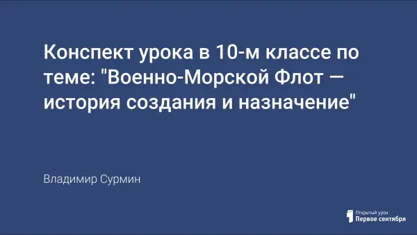 Основы воинской службы - один из основных разделов ОБЖ в старших классах. На данном уроке используются доклады, которые готовят учащиеся. Учитель заранее дает тему доклада и помогает в подборе материала. Целью является: сформировать представление о значении ВМФ, истории создания и развития флота; развивать речь учащихся, умение работать с литературой; воспитывать патриотизм, гордость за свое Отечество.