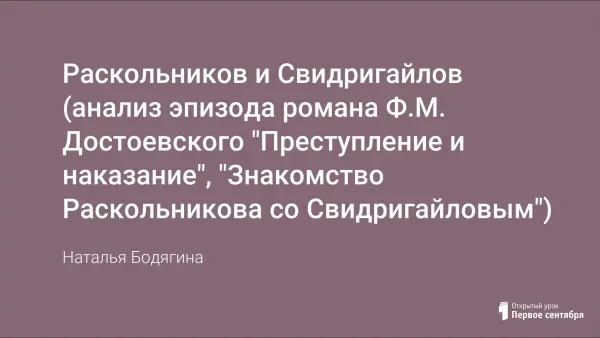 В ходе анализа эпизода "Знакомство Раскольникова со Свидригайловым" на уроке устанавливаются смысловые связи этого эпизода с предыдущими и последующими фрагментами романа; выявляются средства раскрытия внутреннего мира Раскольникова; выясняется роль образа Свидригайлова в романе, которая заключается в том, чтобы показать борьбу добра и зла в душе Раскольникова, углубить психологическую характеристику героя-идеолога, показать бесперспективность пути человека, живущего по принципу "всё позволено".