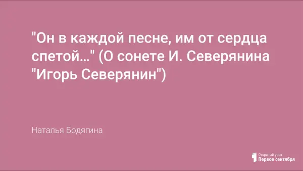 Сонет "Игорь Северянин" - сонет-автопортрет. В нём отразились представления поэта о мире и своём месте в нём, о назначении поэзии. Теза (мир поэта) и антитеза (мир толпы) в сонете противопоставлены не только содержательно, но и на лексическом и синтаксическом уровне. Снятие противопоставления происходит в синтетической части сонета, где создается образ поэтического мира Северянина, являющегося отражением его внутреннего мира и реакцией на происходящее во внешнем мире.