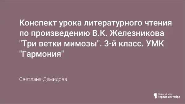 Конспект урока литературного чтения по произведению В. Железникова "Три ветки мимозы" для 3-х классов. Важным моментом в развитии школьников считаю формирование грамотного читателя, владеющего приёмами понимания прочитанного, умеющего самостоятельно выражать свои чувства и мысли. Предлагаемые на уроке моменты деятельности учащихся создают условия для раскрытия творческих способностей учащихся.