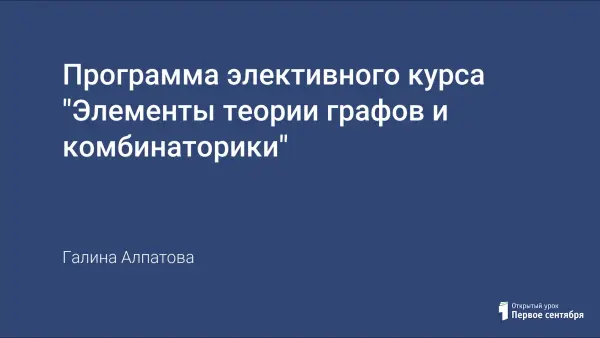 Курс "Элементы теории графов и комбинаторики" является дополнительным к стандартному курсу математики 5-го класса для образовательных учреждений с повышенной интеллектуальной подготовкой. Цель курса - сформировать у учащихся основы элементарных знаний по теории графов и комбинаторике.