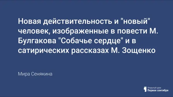 Урок: показывает основные особенности изображения новой действительности и "нового человека" в повести М.Булгакова и в сатирических рассказах М.Зощенко; рассматривает отношение писателей к поднимаемым ими проблемам; показывает мастерство и гражданское мужество писателей.