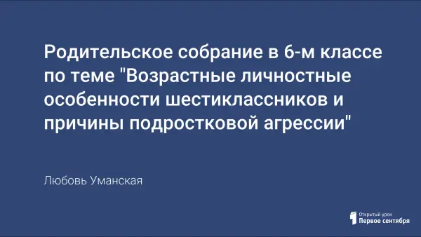 Цели собрания: познакомить родителей с возрастными личностными особенностями шестиклассника и причинами подростковой агрессии; показать родителям, какое влияние оказывает стиль взаимоотношений подростка с родителями, на развитие личности и на формирование стиля отношений подростка к другим людям; дать рекомендации родителям по предупреждению детской агрессии.
