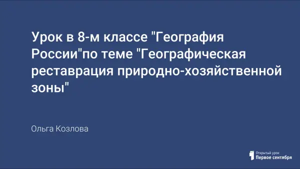 Представлен конспект урока географии по теме "Географическая реставрация природно-хозяйственной зоны" в 8-м классе. Содержание и форма обучения на данном уроке будет способствовать умению адаптироваться к условиям быстро меняющегося мира, находить оптимальные решения задач разных уровней и масштабов.