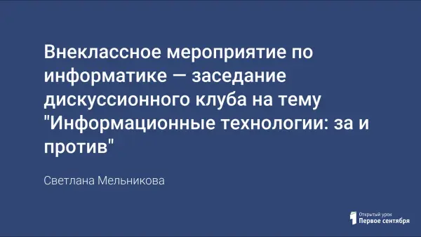 Влияние персонального компьютера на человека в современном мире и его роль в судьбе ощущает каждый из нас. Не обладая компьютерной грамотностью, человек теряется в профессиональной жизни, что влияет и на его личную. Один из способов привлечения к изучению предмета информатика – это организация работы дискуссионного клуба. Тематику заседаний, план проведения и ведущих члены клуба выбирают сами, учитель является только помощником. Дети учатся когнитивным умениям, которые необходимы не только в профессиональной деятельности, но и в становлении личности в обществе.