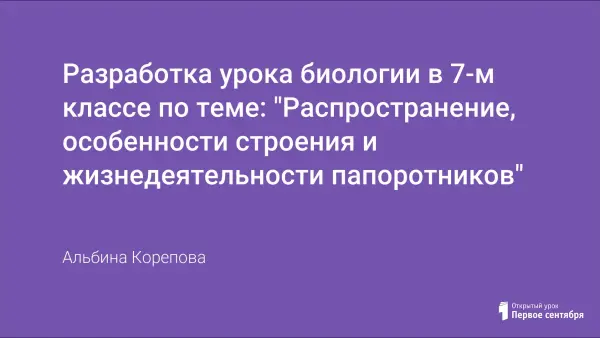 Урок проводится в 7-м классе по программе Н.И. Сонина по теме "Отдел папоротниковидные" (первый урок). Предлагаемый урок формирует у учащихся умение устанавливать причинно-следственные связи, используя приемы "знаю, хочу узнать, узнал", способствует созданию условий для саморазвития личности, а так же формирует рефлексивную деятельность. Групповая работа на уроке помогает выявлять индивидуальные особенности ученика и способствует развитию критического мышления.