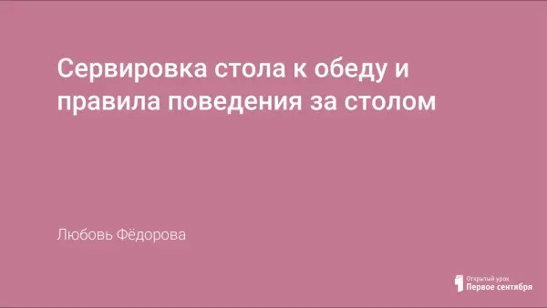 Цели урока: совершенствовать умения по подготовке стола к приему пищи с учетом санитарно-гигиенических, эстетических, практических требований; обобщить материал по культуре поведения за столом; воспитывать общую культуру.