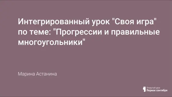 Урок для 9-го класса, цель которого – обеспечить повторение, обобщение и систематизацию материала по темам "Арифметическая и геометрическая прогрессии", "Правильные многоугольники", построен в форме игры ("Своя игра"). Использование игровой и информационной технологий значительно повышает эффективность процесса обучения благодаря заинтересованности обучающихся, расширению наглядности, позволяет сделать урок более мобильным и интересным.