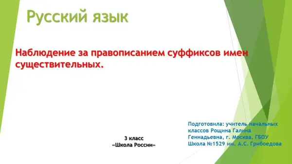 Представлена презентация к уроку русского языка в 3-м классе по теме "Правописанием суффиксов имен существительных".