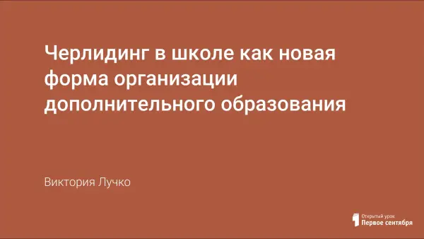Черлидинг зародился в США в конце 1880-х годов, а приобрёл наиболее широкое распространение в 1970-е годы. Примерный перевод названия: руководитель группы поддержки команды. Кроме того, что черлидинг выступает как самостоятельный вид спорта, он успешно сопровождает многие спортивные соревнования, усиливает зрелищность других видов спорта. В статье рассмотрены основные принципы организации команды по черлидингу в основной и средней школе, принципы построения и методика проведения тренировок с обучающимися, учитывающие опыт работы автора статьи, подготовившей призеров Открытого Чемпионата Федерации Черлидинга России (2013 г.) и призеров Открытого Кубка Евразии по черлидингу в номинации «групповой стант» (2013 г.), призеров Открытого Кубка Федерации Москвы и Московско области по черлидингу «Будущие звезды» (2014 г.).