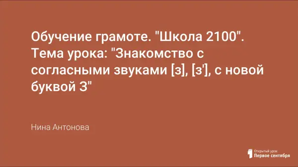 Представлен сценарий урока, на котором ученики знакомятся с согласными звуками [з], [з'] и буквой З. У детей развивается речь, они работают над лексическими значениями слов, прививается любовь к чтению.