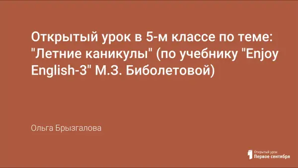 Открытый урок в 5-м классе по теме "Летние каникулы" способствует развитию практического владения языком, совершенствует навыки и умения понимания речи на слух, закрепляет речевые образцы, грамматические структуры, лексику по теме.
