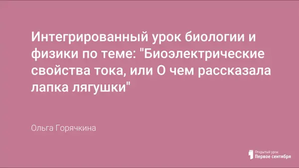 Интегрированный урок биологии и физики. Урок включает в себя демонстрацию сложных приборов (осциллограф, электроскопы, электрофорная машина, проводник) и опытов с натуральными объектами (лягушка). Содержание теоретической информации содержит исторические факты, связанные с открытием электрических явлений, и роль в этом биологических объектов, роль ученых-биологов в открытии и исследовании электричества.