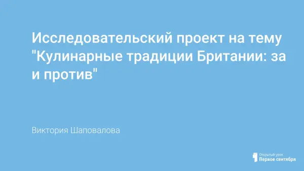 Национальная кухня – важнейший элемент традиций всех народов, берущая свое начало со времен зарождения народов и этносов. Английская кухня славится на весь мир качеством и достаточно консервативным ассортиментом. Национальная кухня Британии формировалась на протяжении многих веков, начиная со времен до нашей эры, когда острова были заселены местными кельтскими народами. На британскую кулинарию особенно сильно повлияли индийские традиции, в викторианскую эпоху сложилась английская традиция чаепития. Немалое влияние оказала также и география страны: островное положение способствовало популярности рыбы и морепродуктов у местного населения. Так сложилась современная британская кухня. Несмотря на распространение английской культуры по всему миру, кулинарные традиции Британии не получили международного признания. Британскую кухню называют простой, неизысканной, лишенной фантазии, сытной и тяжелой. Британцы используют простые и качественные продукты местного производства. Они выбирают несложные и быстрые способы приготовления пищи, при которых сохраняется естественный вкус продуктов. Специи и приправы используются редко и в небольших количествах, они достаточно просты и не меняют, а только подчеркивают вкус блюд. Английские обычаи довольно существенно отличаются от европейских, поэтому представляют интерес для изучения.