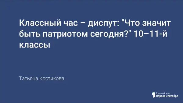 Тема патриотизма – ныне жгучая и больная тема для нашей страны, для русских людей. Как пробудить в ребёнке чувство любви к Родине? Именно пробудить, потому что оно есть в каждой душе, и надо его усилить точным, чистым тоном. Нельзя заставить любить Отечество: любовь надо воспитывать. Именно это явилось целью диспута "Что значит быть патриотом сегодня?".