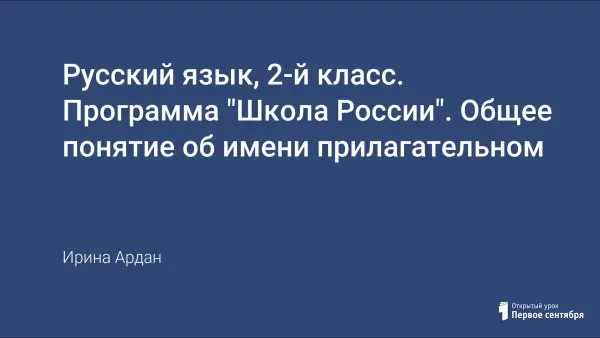 Урок русского языка во 2-м классе по программе «Школа России» (учебник Зеленина). Это первый урок темы «Имя прилагательное». Проводится с опорой на мультимедийную презентацию. Урок построен и проведен в проблемно-диалоговой технологии обучения, содержит творческую работу.