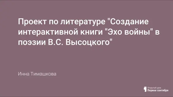 Практико-ориентированный групповой проект по литературе посвящен поэзии В.С. Высоцкого, рассчитан на учащихся 10–11-х классов, представляет собой конструктивное исследование и практическое создание интерактивной книги. Цель: формирование духовной памяти: воспитание уважения к прошлому, моральных ценностей.