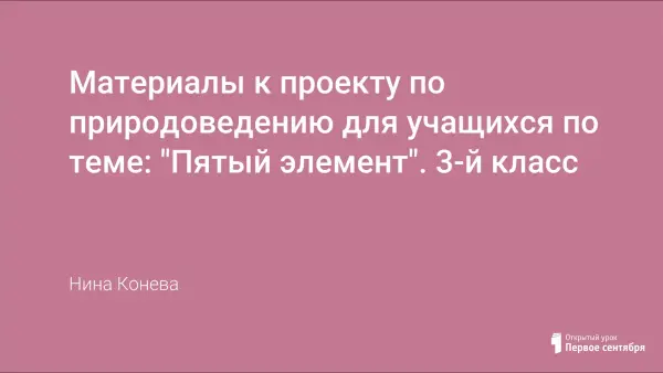 Данный проект рассчитан на 7 часов аудиторных занятий с учащимися. В основе проекта лежит тематическое планирование по учебнику А.А. Плешакова "Мир вокруг нас". Цель проекта: представить целостную картину взаимосвязи 4 элементов природы – огонь, земля, вода, воздух – и показать степень влияния человека на окружающую среду. Основа работы в проекте: групповая работа, работа с дополнительной информацией, развитие творческих и аналитических способностей. На занятиях активно используются компьютерные презентации по темам.
