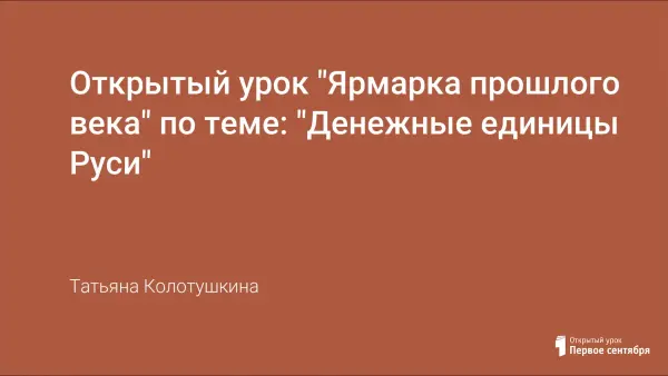 Урок "Ярмарка прошлого века" по теме "Денежные единицы Руси" познакомит детей с денежными единицами Руси, научит пользоваться переводом старых денежных единиц в современные денежные знаки, совершенствует знания, умения и навыки в решении задач разных видов. Данный урок способствует развитию логического мышления, умению быстро переносить знания из стандартных условий урока в реальные жизненные ситуации, формирует у каждого веру в свои силы, способности. А также способствует воспитанию уважительного отношения к историческим корням нашего народа, его быту, традициям.
