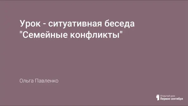 Урок "Семейные конфликты" проводится в форме ситуативной беседы с учащимися среднего звена. Задача урока состоит в рассмотрении понятия – конфликт. На примерах конфликтных ситуаций учитель подводит учащихся к выводу о причинах семейных конфликтов и путях их предупреждения и разрешения. Беседа способствует формированию у школьников способности и стремления к самооценке, самоконтролю и саморегуляции. Организация работы с документами способствует воспитанию правовой культуры детей.