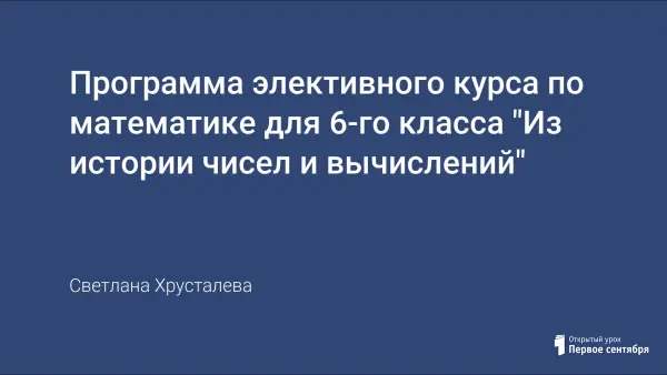 Вашему вниманию предлагается программа элективного курса по математике для 6-го класса «Из истории чисел и вычислений». Данный материал содержит пояснительную записку, учебно-тематический план, краткое содержание занятий. Прилагается список литературы. Программа прошла апробацию.