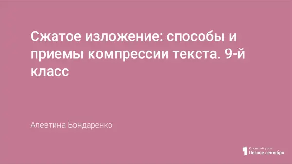 Первая часть ГИА (сжатое изложение) направлена на проверку умения понимать устную речь и воспроизводить её в письменной форме, пользуясь приемами компрессии текста. Урок призван закрепить навыки определения темы, идеи, выделения микротем исходного текста, а также продолжить развивать навыки использования в работе над текстом способов и приемов компрессии.